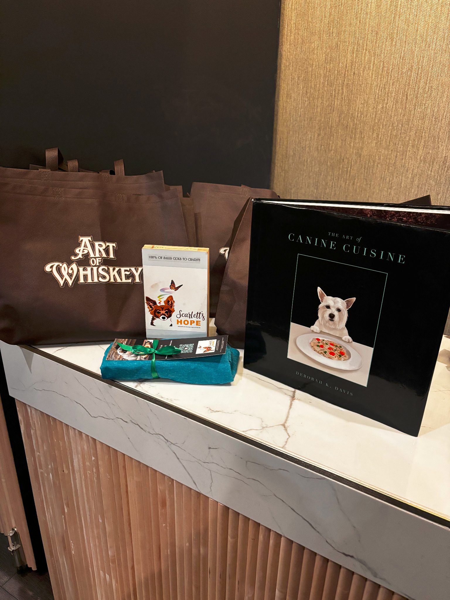 Additional gifting included wellness gummies from Shapenvy Supreme Wellness Supplements, and charitable items from Scarlett's Hope, a nonprofit animal welfare initiative. Scarlett's Hope contributed yoga-style T-shirts and access to purchase The Art of Canine Cuisine, a luxury dog cuisine cookbook featuring healthy, at-home recipes for pets, with proceeds supporting the charity's mission.