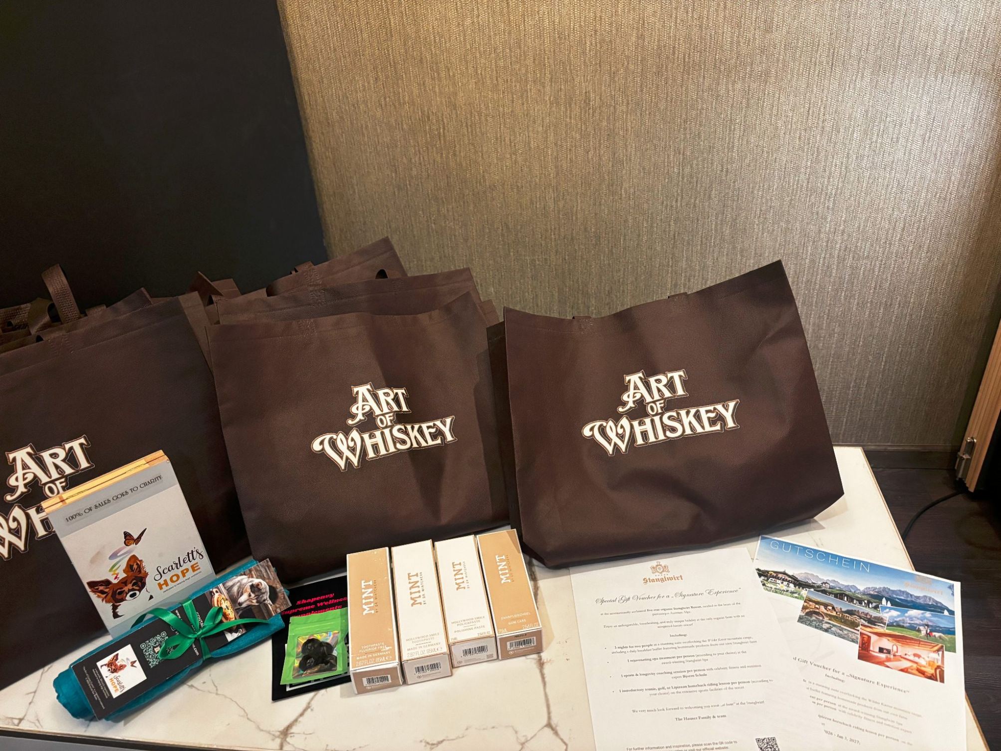 Each guest received a premium Art of Whiskey gift bag featuring carefully selected luxury, wellness, and lifestyle offerings. As part of the gifting experience, guests received a resort booking voucher from Stanglwirt Resort, a renowned five-star Austrian wellness destination located in Going am Wilden Kaiser. Nestled in the Tyrolean Alps, Stanglwirt has hosted notable guests including Gwyneth Paltrow, Jason Statham, and Hillary Clinton, with Arnold Schwarzenegger known as a frequent visitor.