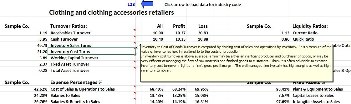 The extensive introduction, as well as notes on the Excel sheet, contains definitions along with an explanation of how each ratio is calculated and interpreted. Included are key benchmarks of financial performance: Turnover Ratios, such as inventory sales turns and inventory cost turns, Expense Percentages, Employment Percentages, such as officer compensation to PBIT, Profitability Percentages, such as gross, operating and net margin, Liquidity Ratios, such as days receivable and days payable and many more.