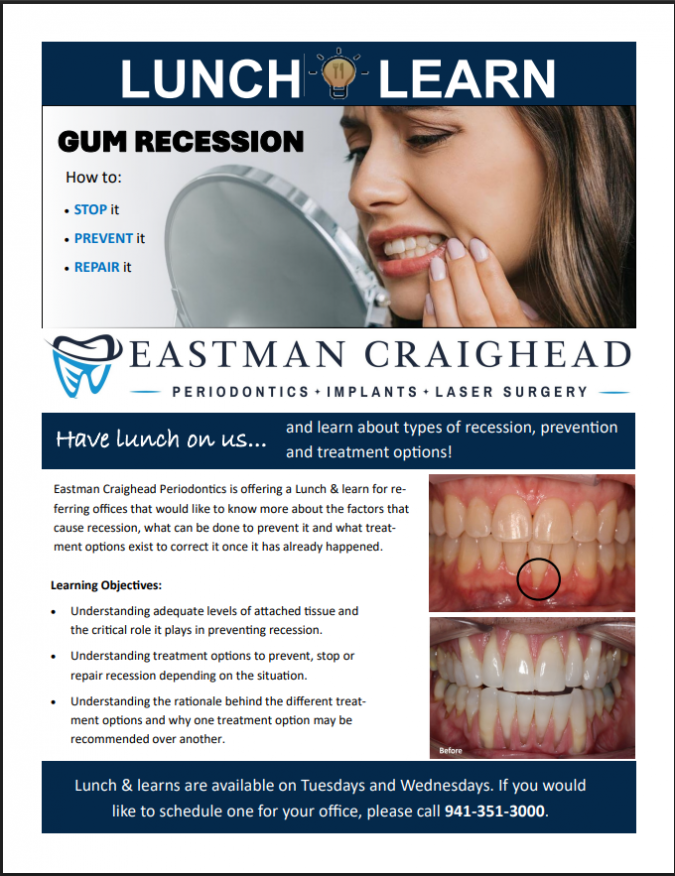 Designed for referring dental offices, the Lunch & Learn sessions offer complimentary education on identifying, preventing, and treating gum recession. Topics include tissue preservation, clinical decision-making, and the latest treatment techniques such as LANAP® laser therapy, grafting procedures, and the Pinhole Surgical Technique (PST®).