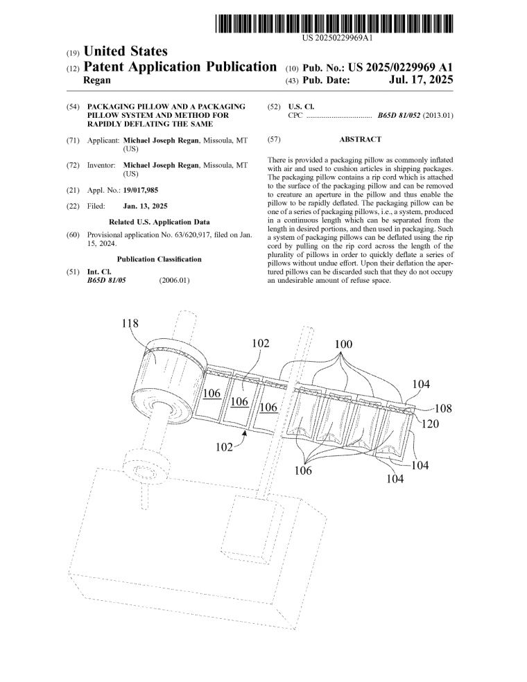 CHICAGO - TelAve -- The invention, titled "Packaging Pillow and a Packaging Pillow System and Method for Rapidly Deflating the Same" (US 2025/0229969 A1), features an integrated rip cord and engineered weakened seam that allows users to quickly deflate multiple connected air pillows in a single motion.
