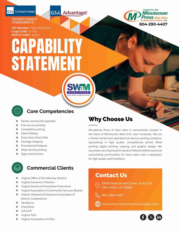 This award strengthens Minuteman Press of Glen Allen's ability to deliver reliable, compliant, and cost-effective printing and communication solutions to government agencies nationwide.