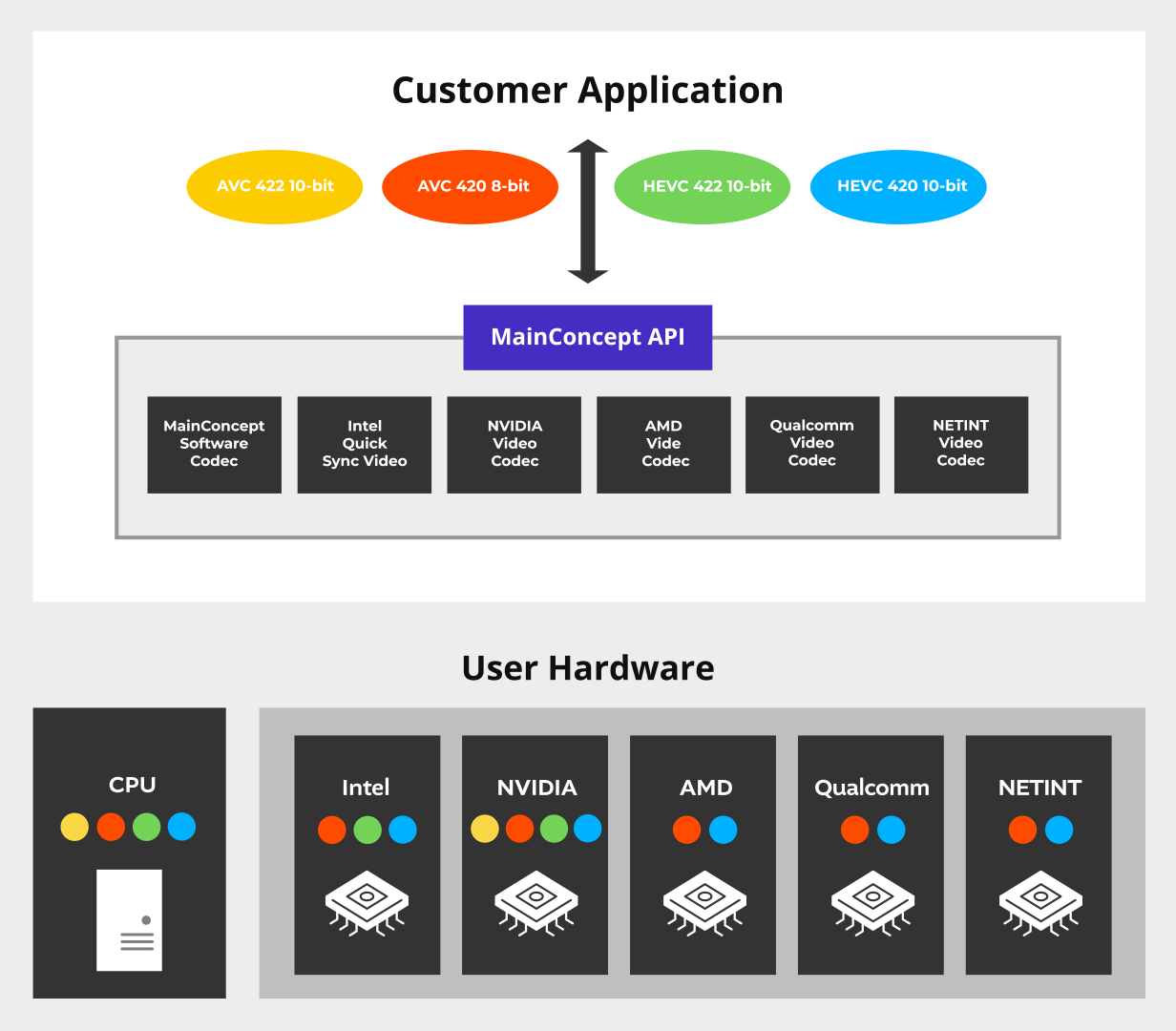 MainConcept EVA provides a unified API to control both hardware and software codecs through a single interface. It enables faster integration, reduced development effort, and flexible deployment across diverse infrastructures. EVA supports GPUs from AMD, Intel, NVIDIA, and Qualcomm, and now extends to NETINT VPU-based encoding and decoding capabilities.