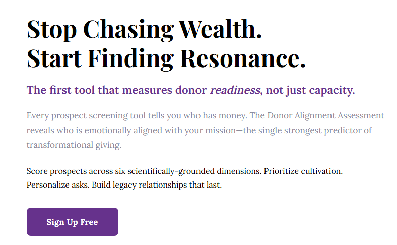 donorassess.org measures the emotional alignment and philanthropic propensity of donors, prospective supporters, and anyone who shares the values of your mission. It gives fundraisers a dynamic, relationship-centered profile that complements — and often surpasses — what traditional wealth screening reveals.