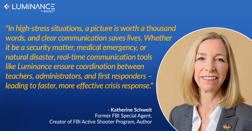 "Technology like Luminance gives administrators and first responders real-time situational awareness, enabling critical and informed decisions during incidents," said Katherine Schweit, former FBI Special Agent and school safety advocate. "Solutions like this save lives."