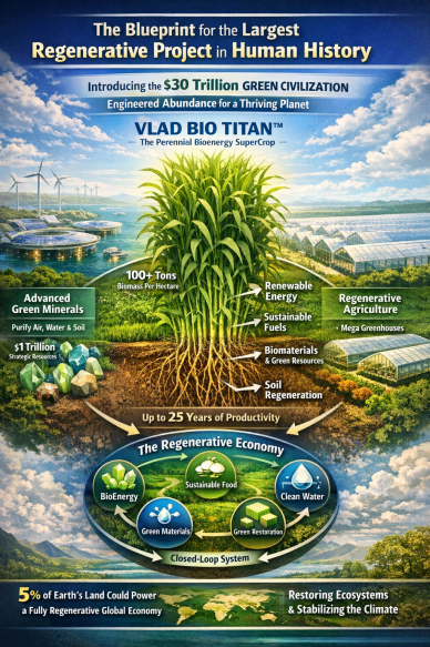 Central to this vision is VLAD BIO TITAN™, a revolutionary perennial bioenergy system engineered over decades. Producing over 100 tons of biomass per hectare annually, it functions as a living solar engine, capturing sunlight, converting it into renewable energy, sustainable fuels, and biomaterials, while simultaneously regenerating soil ecosystems. Its deep-root architecture restores mineral cycles, enriches microbial life, and sustains productivity for up to 25 years from a single planting.